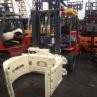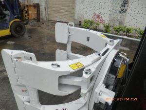 Klemmen er et gaffeltruckfeste som inkluderer en ramme, en arm koblet til rammen og en sylinder koblet til armen. Holdearm inkluderer venstre og høyre arm. Den ene enden av sylinderen er hengslet med venstre arm, og den andre enden av sylinderen er hengslet med høyre arm. Venstre arm og høyre arm styres til å åpne og lukke av oljesylinderen. Minst ett første grensehull er anordnet til venstre for hengselpunktet på den første koplingen, og den andre koplingen er forsynt med minst ett første begrensende hull til høyre for hengselpunktet. Det første begrensende hullet er satt inn med en første begrensende komponent for å begrense lukkevinkelen til venstre arm og høyre arm, som for å begrense minimum klemvinkel for klemmen og forhindre kollisjon av venstre arm og høyre arm. Det er et første grensehull i holdeklemmen, som kan begrense lukkevinkelen til venstre arm og høyre arm for å begrense minimum klemvinkel for klemmen og forhindre kollisjon av venstre og høyre arm. Da kan den klemme mindre gjenstander. Strukturen er enkel, lett å betjene og har sterk praktisk funksjonalitet.
